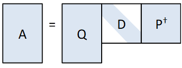 任意のAに対して分解可。Aは正方行列でなくてもよい。 Dの対角要素(特異値)は一意に決まる。 さらにAが正方行列で特異値がすべて異なるとき、Q,Pは符号を除いて一意に決まる。 理論上はA†Aの固有値分解を経由して計算できるが不安定なので、実用上は収束するまで反復計算する |